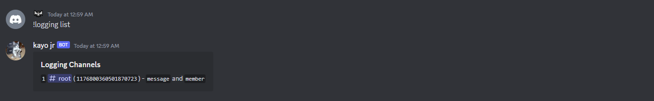 As an example, suppose you are already logging member events to the #log channel and want to add message events. In that case, you would execute the following: